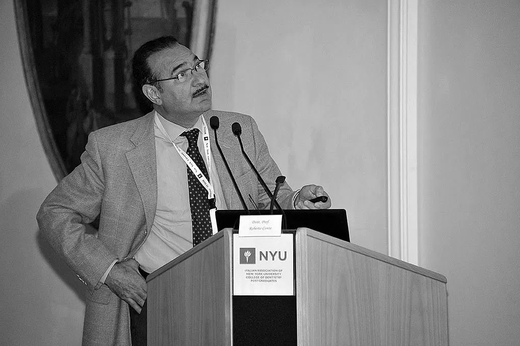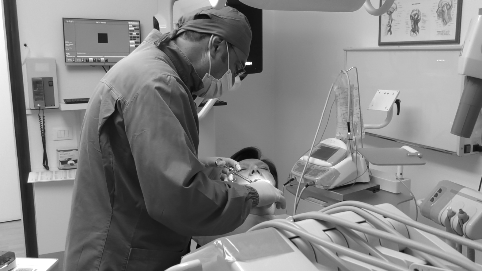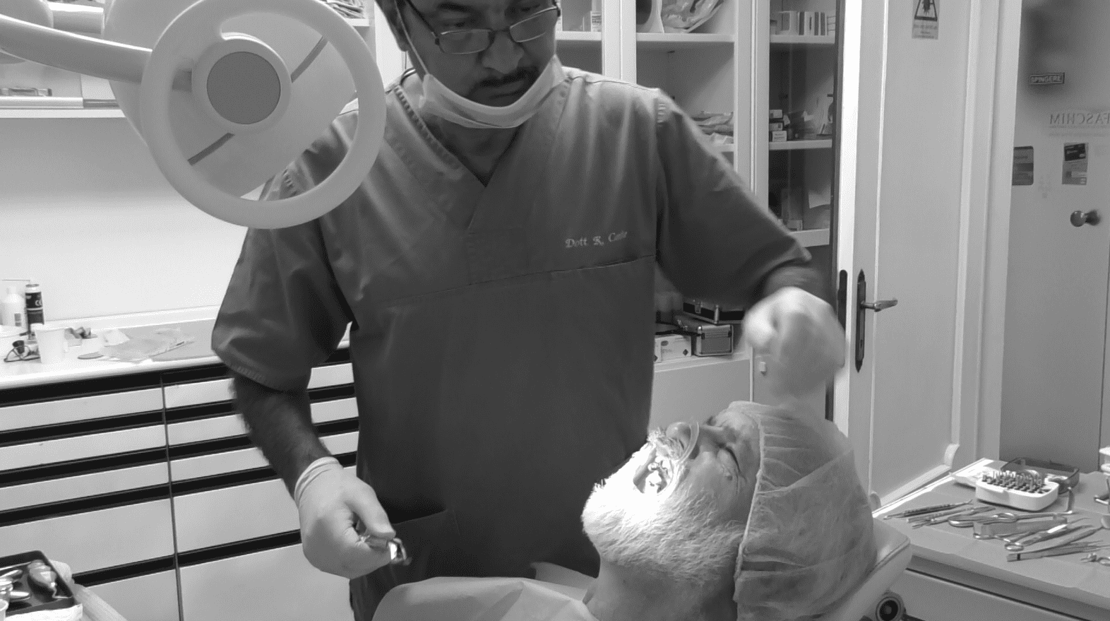 - Identifying empty sockets resulting from previous dental extractions, Prof. Conte proceeds to fill them with biocompatible material.