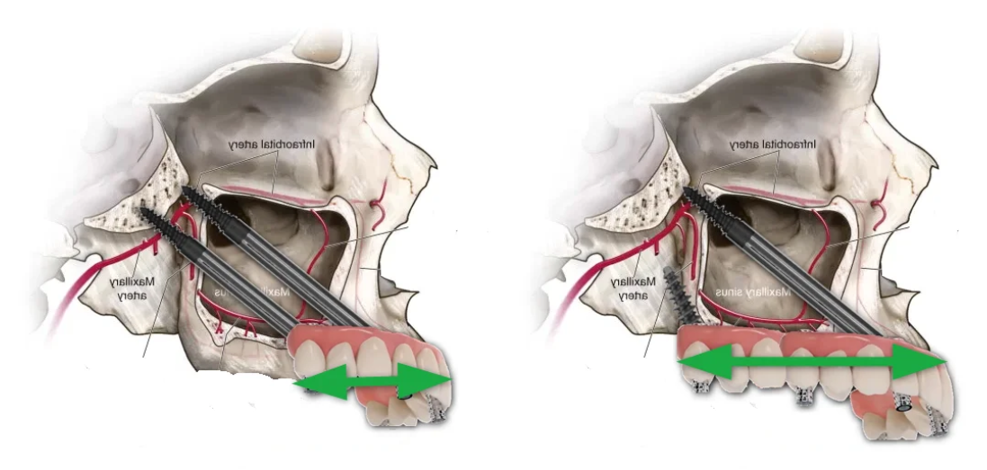 - In some cases, zygomatic pterygoid implantology can reduce waiting times, allowing for the application of fixed prosthetics in shorter durations.